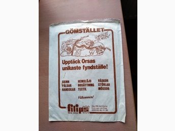 Kuriosa: Handlaren Filip Sundberg. Papperspåse med reklam för Gömstället.