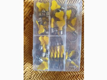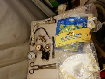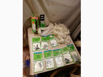 Diverse skruvar, brickor, lampa, kryssbits och lina