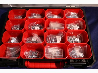 Skruvar, muttrar och brickor i förvaringslåda sortiment bultar Tum strl