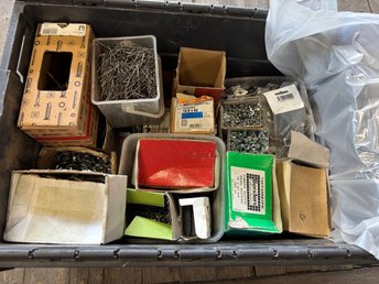 Låda med blandade skruvar, muttrar och spik