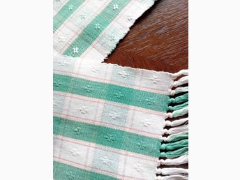 Handvävd löpare i mintgrönt och vitt med knutna fransar 90 x33 cm, som ny