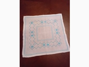 liten duk, tablett, vitt m. brodyr i turkos, langett, plattsöm mm. ca 30 x 30 cm