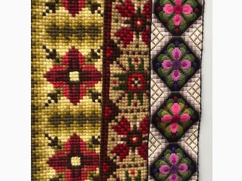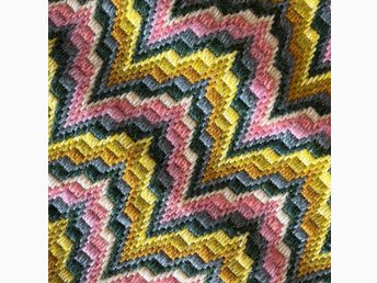 Vackert ullbroderi med zick-zackmönster i rosa gul grön – retro 60-tal nyskick!