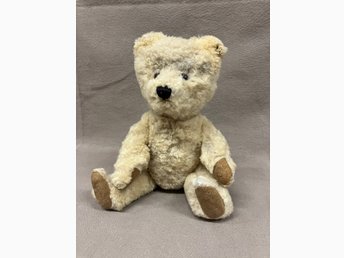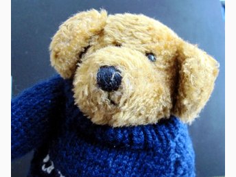 Fin liten nallebjörn, möjligen Steiff, verkar vara stoppad med halm, hål se bild