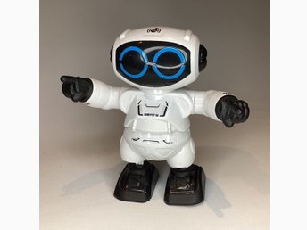 Leksaksrobot, 20 cm hög, vit med svarta och blå detaljer